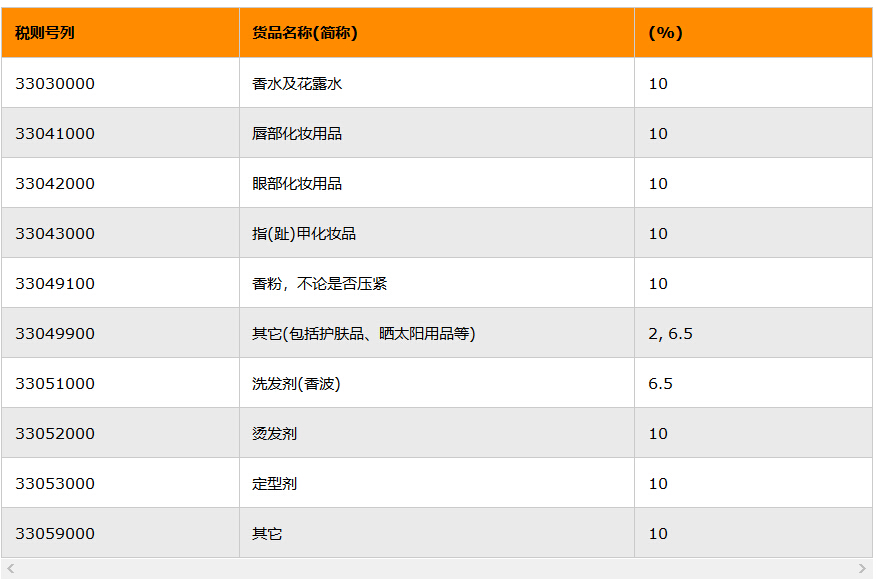 7. 根據(jù)WTO承諾,唇用、眼用化妝品及香粉自2005年1月1日起執(zhí)行10%的最終約束稅率,其它進(jìn)口化妝品稅率從2008年起執(zhí)行6.5%的最終約束稅率。2017年主要化妝品關(guān)稅摘要: